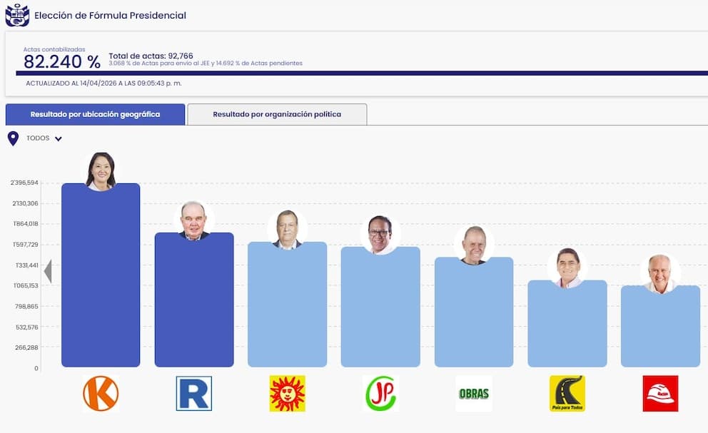 Estos son los resultados oficiales de los principales candidatos presidenciales en Perú, según la ONPE al 82.240% de actas contabilizadas (actualizado al 14/04/2026 a las 21:05):