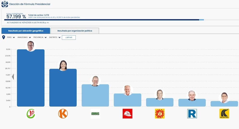 Estos son los resultados oficiales de la ONPE en la región Amazonas al 57.199% de actas contabilizadas (actualizado al 14/04/2026 a las 16:46):