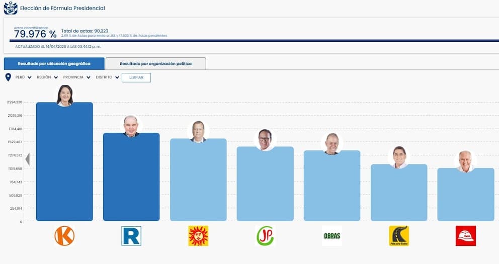 Estos son los resultados oficiales de los principales candidatos presidenciales en Perú, según la ONPE al 80.030% de actas contabilizadas (actualizado al 14/04/2026 a las 18:07):